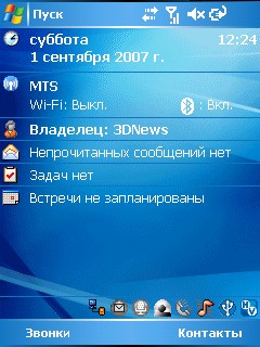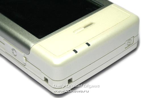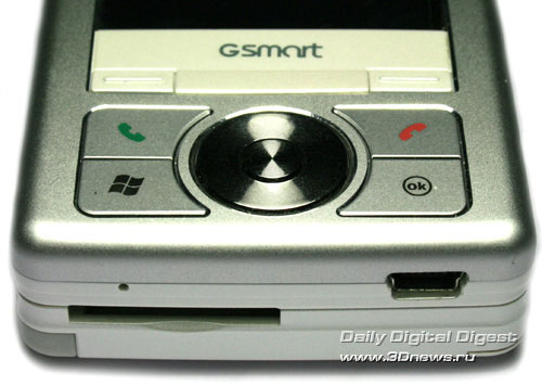 КомплектацияУстройство поставляется в необычной коробке в форме куба, оформленной в фирменных для бренда GSmart цветах – зелёном и белом. Внутри, кроме самого коммуникатора, был обнаружен следующий набор аксессуаров: проводная гарнитура, дополнительный стилус, кабель mini-USB - USB, зарядное устройство, краткое описание конструкции и два CD с программным обеспечением. ![]() Комплектация ничем примечательным не отличается. Правда, стоит отметить, что выполнена она не в едином стиле – часть кабелей белая (под цвет устройства), а часть чёрная. Поэтому при беглом осмотре можно говорить о том, что новинка определённо нацелена на бюджетный класс. Впрочем, огорчает только одно – отсутствие чехла в комплекте. ДизайнGSmart i300 – один из немногих коммуникаторов, оформленных не в серых “офисных” тонах. Его корпус выполнен из белого с перламутровым отливом пластика, а лицевая панель серебристая. Окраска пластика качественная, но долго ли она продержится при интенсивном общении с устройством, сказать сложно. Сочетание цветов неплохое, однако, немного портит впечатление дизайн корпуса, а вернее, – его отсутствие. GSmart i300 – классический “кирпич”, без намёков на авторскую идею. В руке аппарат лежит и не плохо, и не хорошо. Пластик, из которого он выполнен, приятен на ощупь и достаточно дорого смотрится. Пальцы не попадают автоматически на нужные кнопки – необходимо некоторое время для привыкания к новой игрушке. ![]() Итак, давайте познакомимся с новинкой ближе… Над дисплеем традиционно расположен встроенный динамик для разговора, а также два светодиодных индикатора режимов работы. Под дисплеем, не менее традиционно, расположены основные управляющие клавиши, которых у новинки шесть, а также четырёхпозиционный джойстик в виде металлического кольца с дополнительной пятой круглой кнопкой подтверждения в центре. ![]() Блок с джойстиком и четырьмя серебристыми клавишами по бокам смотрится симпатично (пожалуй, это самый стильный элемент из дизайна всего GSmart i300). Но ещё две кнопки, расположенные непосредственно под дисплеем, а также белая пластиковая вставка с надписью “GSmart” раздражают глаза внешним видом, не вписывающимся в общую картину. Дополнительные кнопки, те, что не так часто используются в процессе работы, находятся на боковых гранях. На верхнем торце есть миниатюрная прямоугольная кнопка, отвечающая за включение и отключение питания. Здесь же, на противоположном углу, находятся отверстия для крепления к коммуникатору шейного шнурка. ![]() Левый борт несёт на себе сдвижную подпружиненную многофункциональную клавишу, отвечающую, например, за движение по меню или регулировку звука. Надо отметить, что расположена эта клавиша очень удобно, в верхней части, как раз там, куда попадает указательный палец, если вы держите коммуникатор в правой руке. Если вы левша или предпочитаете держать трубку в левой руке, то и в этом случае сдвижную клавишу легко задействовать, по необходимости перенося на неё большой палец. Правый борт имеет дополнительную кнопку, расположенную чуть ниже центра. По-умолчанию на неё возложена функция активации цифровой камеры. Рядом находится кнопка перезагрузки устройства, которую традиционно нужно нажимать каким-либо острым предметом. Несколько выше здесь же, под пластиковой заглушкой, расположен разъём для подключения гарниту