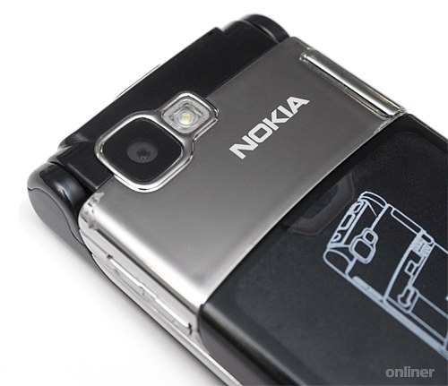 Весьма аскетично выглядит задняя часть телефона. Здесь размещен лишь модуль 2-мегапиксельной камеры со вспышкой. Внизу имеется небольшой прямоугольник с пластиком, фактура которого напоминает прорезиненный материал. Он предотвращает скольжение аппарата. Задняя крышка съезжает вместе с боковыми закраинами и кнопками. Крепится она довольно жестко и вряд ли когда-нибудь разболтается. Обнаженная начинка телефона выглядит довольно оригинально, особенно если вынуть батарейку BL-4B на 700 мАч. Как нетрудно заметить, емкости аккумулятора несколько недостаточно (батарея, кстати, вполне обыкновенная, применявшаяся, к примеру, в телефонах Nokia 6111 и 7370).