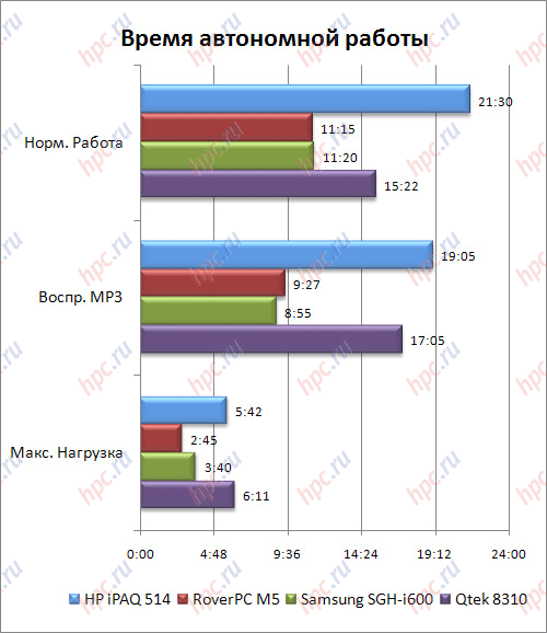 Время автономной работыВ коммуникаторе установлена батарея емкостью 1100 мАч. Это - не самая большая цифра, поэтому давайте посмотрим, как проявит себя HP iPAQ 514 в тесте на время автономной работы, который проведен по нашей традиционной методике. Режим максимальной нагрузки. Яркость подсветки выкручена на максимум, громкость динамика - тоже, включен Wi-Fi в режиме поиска сети и Bluetooth, через Windows Media Player Mobile в цикле воспроизводится видеоролик. Время автономной работы в этом режиме составило 5 часов 42 минуты. Нормальная работа. Bluetooth и Wi-Fi выключены. Яркость подсветки установлена на минимум. На коммуникаторе запущено чтение текста в программе Alreader с автоматической прокруткой. Время работы составило 21 час 30 минут. Воспроизведение МР3. Wi-Fi и Bluetooth выключены. Дисплей выключен. Прослушивание через наушники на максимальной громкости. Использовался Windows Media Player Mobile и файлы с битрейтом 192 Кб/c. Время работы - 19 часов 05 минут.