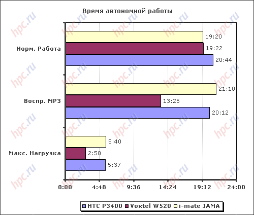 Время автономной работыi-mate JAMA оснащен литий-ионным аккумулятором в 1020 мАч. Давайте посмотрим какие результаты покажет аппарат на наших стандартных тестах. 1. Режим максимальной нагрузки. Подсветки включена, громкость динамика выставлена на максимум, включен Bluetooth модуль, через Windows Media Player в цикле воспроизводится "тяжелый" видеоролик. Время автономной работы в этом режиме составило – 5 часов 40 минут. 2. Чтение текста. Все беспроводные модули отключены. Включена подсветка. На коммуникаторе запущено чтение текста в программе Haali Reader с автоматической прокруткой. Время работы составило – 21 час 10 минут. 3. Воспроизведение МР3. Bluetooth и экран выключены. Прослушивание через наушники на максимальной громкости. Использовался стандартный Media Player и композиция с постоянным битрейтом (192 Кб/c). Время работы - 19 час 20 минут. Что ж, результат вполне достойный подражания. При средней нагрузке коммуникатор способен проработать максимум 2,5 дня без подзарядки, так что перед третьими сутками его лучше подзарядить. А вот как выглядят результаты i-mate на фоне «одноклассников».