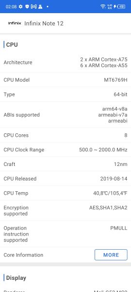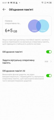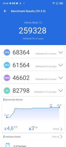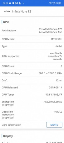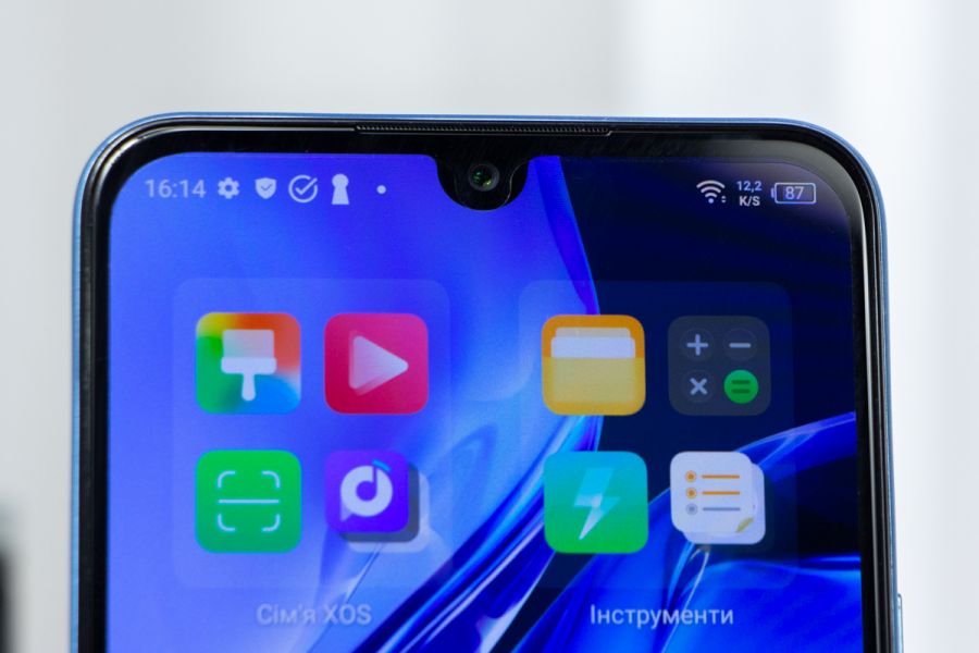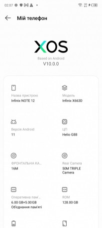 Кути огляду без нарікань. Кольори виглядають яскравими, а текст і зображення – чіткими під будь-яким кутом. Хоча екран і не підтримує високу частоту оновлення, висока частота дискретизації дотику в 180 Гц допомагає під час гри. Апаратна складова і ОС 4G смартфон Infinix Note 12 працює на 8-ядерному процесорі MediaTek Helio G88, який гарантує мінімум 259 тис. балів в бенчмарку Antutu. За графіку відповідає модуль Mali-G52 MC2, оперативної пам’яті 6 ГБ, а основної 128 ГБ. Важлива і корисна функція – можливість розширення оперативної пам’яті до 11 ГБ за рахунок основної. Це робиться вручну через налаштування, пункт меню «Об’єднання пам’яті». Можливі варіації +2,+3 та +5 ГБ. Актуальна дана функція для користувачів, які активно користуються великою кількістю додатків та постійно перемикаються між ними. Два тижні активного користування пристроєм не виявили жодних претензій до апаратної складової, включаючи бездротові мережі Wi-Fi 2.4 і 5 ГГц (максимальна швидкість, яку вдалось зафіксувати – 130 Мбіт/с на скачування та 138 Мбіт/с на відправку), Bluetooth 5.0, NFC. Смартфон на огляді – 4G пристрій, чого точно вистачає для українських мереж. Якість та стабільність зв’язку без нарікань. Гучність розмовного динаміка достатня навіть для розмов у міському транспорті. Мультимедійний динамік працює разом з розмовним і таким чином створюється стереозвучання. На максимумі до чистоти звучання є претензії, але гучність висока. В іграх смартфон не перегрівається, основні 3D хіти запускаються, але присутнє обмеження по деталізації, адже процесор не з флагманських. Note 12 працює на XOS 10.0 на базі Android 11. Цей інтерфейс вже доволі давно використовується виробником, тому доопрацьований максимально. Анімація плавна, інтерфейс коректно реагує на всі ваші дії, вмонтованого софта, який би не було можливості відключити, не помітив. Корисні функції смартфону, якими активно користувався сам: