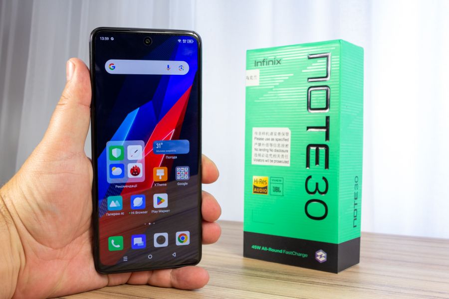 Огляд смартфона Infinix NOTE 30: доступна ціна за Helio G99, зарядку 45 Вт і великий дисплей 120 ГцКомпанія Infinix поступово насичує ринок новими моделями від доступних до преміальних, а головне дуже цікавих смартфонів із серії HOT, NOTE і ZERO, які часто обходять своїх конкурентів за характеристиками. Нова модель Infinix NOTE 30 також готова до бою у своїй ціновій категорії, адже оснащена продуктивним процесором Helio G99, швидкою зарядкою на 45 Вт, подвійним динаміком та великим екраном з частотою 120 Гц. Всі подробиці по характеристикам, кількості набраних балів в тесті Antutu та враження від пристрою дізнаєтесь з огляду. Дизайн і Корпус Перший погляд на NOTE 30 дає зрозуміти, що це сучасний смартфон з трендових матеріалів. Тилова панель отримала скляне матове покриття з окремим дзеркальним острівцем під камерами. Причому реалізація дзеркала дуже оригінальна, воно ніби порізане на полоси. Це додає унікальності дизайну і красиво переливається на світлі. Окремо відзначу тилову панель з точки зору практичності. Матеріал взагалі не збирає відбитки пальців. Окрім чорного кольору корпусу (Obsidian Black) покупцю в Україні смартфон доступний у кольорі Interstellar Blue. У корпусу пласкі боки з глянсового пластику, заокруглені краї на переходах та невеликі рамки навколо дисплея. Верхня особливо тонка навіть з врахуванням розміщеного в ній спалаху з двох світлодіодів. По елементам управління у смартфоні NOTE 30 без сюрпризів. На правому торці спарена клавіша регулювання гучності та кнопка живлення суміщена зі сканером відбитка пальців. Кнопки зручні і для них підібрали правильну висоту під великий палець правої руки. Дуже зручно, що сканер може спрацьовувати лише після натискання кнопки живлення, а не відразу після прикладання пальця до нього. Дана опція налаштовується. На лівому торці висувний лоток для двох SIM-карт і місцем під картку пам’яті. Зверху розміщено один з динаміків і напис "SOUND BY JBL". Виробник наголошує покупцю на тому, що динамік налаштований за допомогою спеціалістів компанії JBL. Стереозвучання при перегляді відео та навіть при прослуховуванні музики сподобалось. Максимальної гучності вистачає на невелику кімнату. В налаштуваннях доступний DTS Sound і еквалайзер. Знизу решітки ще одного динаміку, 3,5-мм аудіороз'єм, основний мікрофон і Type-C порт. Селфі-камера розташована в отворі в дисплеї. Він чималий, але з вдало підібраними шпалерами це не критично. Габарити смартфона 168.62 х 76.6 х 8.58 мм, вага - 219 г. Це комфортні значення для середнього розміру руки і більше. По якості збірки без зауважень. Дисплей Infinix NOTE 30 укомплектували великим 6,78-дюймовий дисплеєм з підтримкою частоти 120 Гц. Роздільна здатність 1080 x 2460 пікселів, пікова яскравість 580 ніт, підтримується колірний простір DCI-P3 та присутня сертифікація Widevine L1 DRM. З мінімальним рівнем підсвітки комфортно читати в повній темряві, а от макисмального значення не завжди вистачає при зчитування інформації на вулиці в дуже сонячний день. В налаштуваннях можна обрати колірний режим та колірний профіль - оригінальний або яскравий, увімкнути нічний режим та обрати частоту. Можна зафіксувати значення частоти на 60 Гц, на 90 Гц та 120 Гц, або увімкнути автоматичне перемикання швидкості оновлення відповідно до фактичного відображення на дисплеї. Як на мене, то висока частота для екранів смартфона потрібна лише ігроманам, лише вони наочно можуть її