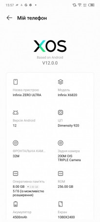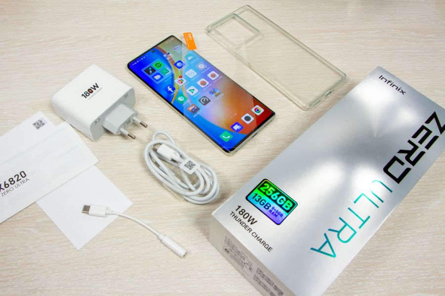Огляд смартфона Infinix Zero Ultra: “майже” флагман з зарядкою 180 Вт і камерою 200 МПікс.Infinix Zero Ultra – це флагман бренду, якщо дивитись на пропозицію компанії на українському ринку. Кращого смартфона по візуальному сприйняттю та набору апаратних характеристик виробник для покупців з України не пропонує. Тож якщо підбираєте собі сучасний по всім параметрам смартфон, Zero Ultra з камерою на 200 Мпікс., підтримкою зарядки 180 Вт, вигнутим екраном з частотою 120 Гц, а також 480 тис. балів в бенчмарку Antutu, вважаю дуже достойним кандидатом. Подробиці дізнаєтесь з огляду. Дизайн і Корпус Zero Ultra – смартфон в корпусі без гострих кутів з плавними обтічними формами, тож в руках пристрій примати комфортно. Габарити 165,5 x 74,5 x 8,8 мм, вага 213 г. Тилова панель зі скла і з цікавим хвилеподібним візерунком, який присутній лише у версії з кольором Coslight Silver. Торці по всьому контуру пластикові, але в колір під метал. Порт 3,5 мм в смартфоні відсутній. А от динаміків аж два – для стереозвуку. Гучність сподобалась, до чистоти можна придиратись лише на максимумі. Мені здалось, що навіть трішки басів у ньому є. Зліва розміщені тонкі, але зручні клавіші налаштування звуку та живлення. Зверху, окрім динаміка, ще є мікрофон. Знизу решітка основного динаміка, лоток для двох SIM-карт і порт USB Type-C. Зібраний телефон дуже добре, екран та панелі щільно зістиковані між собою. Як на мене, виробник хоч і надав перевагу на торцях пластику, але це не погано. Якщо відразу одягнете на корпус чохол з комплекту, або підібраний самостійно, то матеріал стає не таким вже і важливим. Прозорий чохол з силікону передбачений комплектацією. Також в коробці знаходиться простенька плівка на екран, блок живлення та перехідник USB-C – 3.5 мм. Дисплей Вигнутий дисплей – це не буденність у смартфонів з середнього цінового сегменту. Тож Infinix Zero Ultra по цьому параметру виділяється серед конкурентів. Екран 6,8 дюйма з роздільною здатністю 1080 x 2400 пікселів і яскравістю 900 ніт. Матриця AMOLED з частотою до 120 Гц. Зверху панель прикрита захисним склом Corning Gorilla Glass 3. Великий запас по яскравості гарантує комфорт при використанні смартфона на вулиці. Кути огляду дуже хороші. По дисплею варто відмітити підтримку Widevine L1 – можливість перегляду контенту в високій роздільній здатності на стрімінгових сервісах. В екран вмонтовано датчик відбитків пальців, який працює швидко та без помилок. В верхній частині дисплея по центру виріз під фронтальну камеру. В правій частині зверху світиться зелена крапка-індикатор сповіщень, який загорається навіть коли екран вимкнений. Як висновок, можу сказати, що особисто мені подобаються вигнуті дисплеї, відмічаю це як перевагу смартфона Zero Ultra. До того ж у цього смартфона дуже тонкі рамки зверху та знизу, а це додає ефектності під час перегляду відео. Апаратна складова Головним обчислювальним елементом смартфону став чіпсет MediaTek Dimensity 920. Процесор добре оптимізований під багатозадачність, стабільну роботу в мережах, включаючи 5G, підтримує актуальні бездротові мережі та добре справляється з актуальними іграми. Чому добре, а не ідеально? Тому що в нього не найпотужніші ядра, графіка Mali-G68 MC4 і оперативної пам’яті не так вже й багато – 8 ГБ. Тож не кожна гра зможе запускатися на максимальній деталізації. Але не забувайте про можливість віртуального розширення оперативки – ще на 2, 3 або 5 ГБ. Основної пам’яті 256 ГБ,