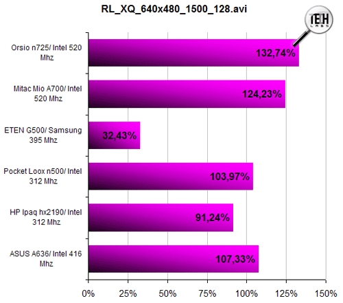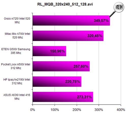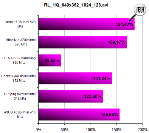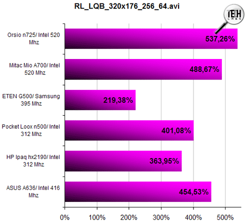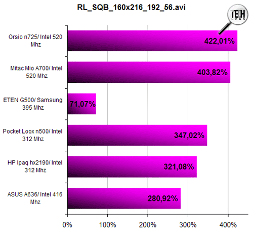 Но на этом мы не останавливаемся и традиционно приступаем к реальным тестам. На очереди стоит видеоплеер TCPMP 0.71, с помощь которого мы узнаем, как "наш герой" покажет себя при воспроизведении тестовых видеороликов различной степени "сложности". Напоминаем, что за нормальный результат мы считаем показатель в 120%. В роли тестового материала выступает трейлер к голливудскому блокбастеру "Матрица". Он конвертирован в пять различных разрешений, чтобы представить, насколько хорошо тестируемый КПК справляется с воспроизведением различных видеофайлов.