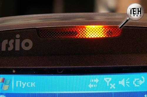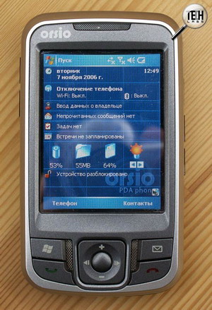По своей форме он, кстати, отдаленно напоминает навигационную клавишу наладонников семейства LOOX компании Fujitsu-Siemens. Если вы помните, то приближенные к прямоугольнику очертания джойстика позволяют безошибочно отклонять его при навигации по меню или выполнении других действий. В центре нави-кнопки разработчики разместили клавишу подтверждения. И все было бы замечательно, если бы не один крошечный недостаток. Дело в том, что высота ее, мягко говоря, чрезмерна, что несколько портит впечатление от отлично продуманной эргономики коммуникатора. Этот, нет, не недостаток, а скорее, недочет, следует также учитывать, кладя ORSIO на стол экраном вниз. Все кнопки, за исключением клавиши подтверждения выбора, не выступают за пределы корпуса, так что, неаккуратно положив коммуникатор, вы можете даже не узнать о том, что только что согласились с удалением важного файла. Впрочем, и от этой проблемы есть лекарство – блокировка клавиатуры. На навигационную клавишу нанесена гравировка – элементы управления воспроизведением в Windows Media Player (регулировка звука, перемотка композиций). Отсутствие софт-клавиш и кнопки «ок» на корпусе означает ухудшение эргономики обращения с Windows Mobile 5.0, где с помощью аппаратных клавиш можно было свести к минимуму обращения к перу и сенсорному экрану. Наконец, осталась самая интригующая часть навигационного блока. По обеим сторонам джойстика приютились системные полифонические стереодинамики! И если бы не декоративные решетки, эффектно прикрывающие их от внешнего вмешательства, то мы, быть может, и не стали бы заострять на них внимание, но… сверкающий металлом гриль не может остаться незамеченным. Что же касается основных функций, возложенных на эту портативную стереопару, то о них мы поговорим чуть позже. Наконец, завершить описание навигационно-управляющего блока нам бы хотелось упоминанием о подсветке двух "телефонных" кнопок коммуникатора.