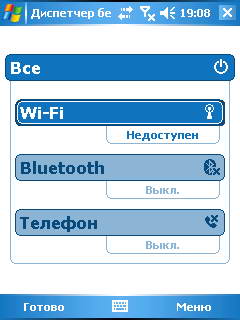 MiniUSB разъем можно использовать не только для синхронизации с компьютером, но и для зарядки коммуникатора по шине USB. Кроме того, этот же разъем применяется для подключения Orsio в качестве GPRS-модема. Централизованное управление всеми беспроводными интерфейсами осуществляется с помощью специальной утилиты, именуемой по обыкновению "Диспетчером беспроводной связи". С помощью одного "клика" стилуса можно включить/выключить все беспроводные интерфейсы или же задействовать каждый по отдельности. Здесь имеется доступ к настройкам.