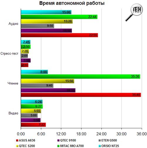 Тестирование проводилось от полного заряда батареи до остатка в 5%. В качестве КПК для сравнения мы выбрали популярные модели коммуникаторов и лидера по времени автономной работы – ASUS A636.