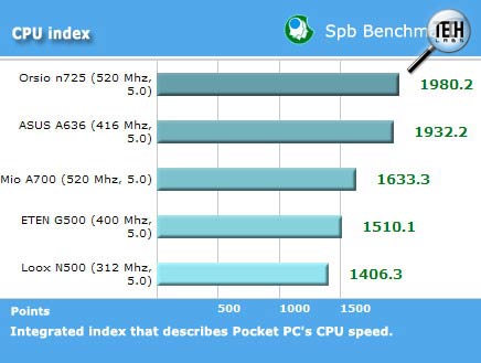 ПроизводительностьКак отмечалось в начале материала, мощность процессора, установленного в Mio A700, может дать фору многим современным КПК, не говоря уже о том, что среди коммуникаторов конкуренцию по этому параметру ему могут составить только два устройства – Qtek 9000/i-mate JasJar и Mitac Mio A700. Для сравнения производительности нами были выбраны схожие по модели процессора или по его частоте КПК и коммуникаторы, базирующиеся на Windows Mobile 5.0: