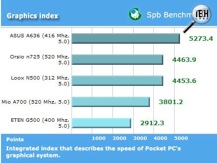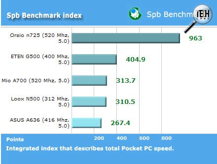Наконец, последний график общего индекса системы по итогам всех тестов. Честно говоря, "наш герой" просто поражает. Подобного результата не достигало ни одно устройство на базе WM 5.0! Вот что значит оптимизация подсистемы памяти, быстрый процессор и слаженная работа всей платформы. Желающие могут ознакомиться с подробными результатами тестов в этой таблице.