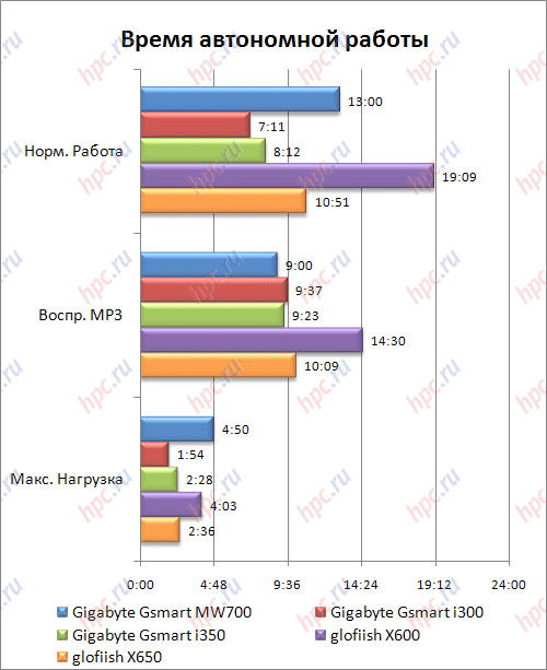 Время работы от аккумулятораКоммуникатор работает от литий-йонного аккумулятора емкостью 1300MAh. Довольно странный выбор, учитывая, какой прожорливый процессор и GPS несет на борту машинка. Поскольку в редакцию попал предпродажный тестовый образец, можно предположить, что аккумулятор нам достался слегка севший. Так или иначе, но результаты оказались более чем скромными. В режиме чтения на среднем уровне подсветки аппарат продержался около 13 часов. В режиме прослушивания MP3 с выключенным экраном на максимальной громкости – около 9 часов. В режиме максимальной нагрузки (включены модули беспроводной связи, активен интернет, запущен фильм) аппарат продержался всего лишь 4.5 часа.