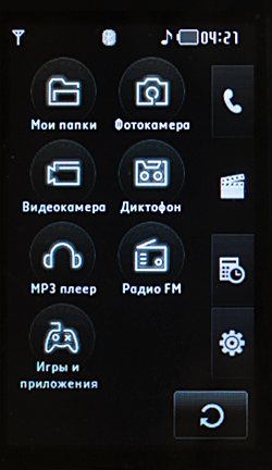 Вторая вкладка главного меню содержит иконки менеджера файлов, фотокамеры, видеокамеры, диктофона, аудиопроигрывателя, радио, игр и приложений. Диктофон работает во время разговора, жесткого лимита на запись нет.