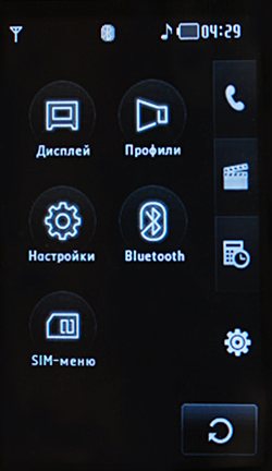 Последняя вкладка открывает настройки телефона: дисплей, профили, настройки, Bluetooth. В этом пункте меню можно настроить яркость и контрастность дисплея, выбрать тему, обои, настроить мелодии звонка и прочие звуки. Здесь же собраны настройки телефона, сети, соединений. Поддерживаются следующие Bluetooth-профили: A2DP, DUN, FTP, HFP, HSP, OPP, SPP, BIP. Подключение к USB осуществляется в режиме сменного накопителя, при этом меню блокируется полностью. Камера