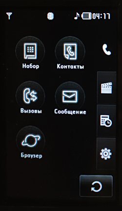 Меню представлено списком иконок и четырьмя вкладками. На каждой вкладке имеются свои иконки. Функции распределены предельно логично и удобно: телефон, мультимедиа, офис и настройки. Кроме меню есть еще и привычный десктоп, показываемый в дежурном режиме. На нем расположены четыре иконки: меню, телефон, сообщения и телефонная книга, а также большие и красивые часы. При клике на них активизируются настройки будильника. Удобный и элегантный маневр. Первая закладка открывается по умолчанию. В ней собраны часто используемые функции: набор номера, контакты, список вызовов, сообщения, браузер.