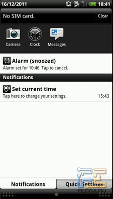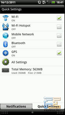 Панель уведомлений состоит из двух вкладок. На одной можно посмотреть пять последних запущенных программ и уведомления. На второй располагаются быстрые настройки беспроводных модулей, ссылка на более подробные настройки и информация об общей, используемой и оставшейся памяти.