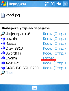 6.3 КПК начнет искать устройства вокруг себя. Вначале он все устройства будет именовать как "Неизвесное устройство", но если подождать правильно присвоит им имена. Вы будем передавать на телефон с именем Enigma. Выбираем стилусом и ждем.