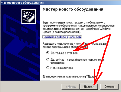 7.2 На компьютере должно начатся обнаружение нового устройства, и вылетит табличка аналогичная той что ниже. Выбираем "Да, только в этот раз". Далее выбираем "Уставнока из указанного места".