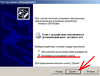 7.3 Далее необходимо указать путь к драйверу от модема. Этот драйвер идет на диске в комплекте, если диска нет, драйвер можно [скачать от сюда]. На диске (идущем в комплекте) он находится в папке Driver, эту папку нам и необходимо указать. С помощью кнопки "Обзор" выбираем эту папку. Ставим галочку "Включить следующее место поиска:", и указываем путь к папке. И жмем Далее.