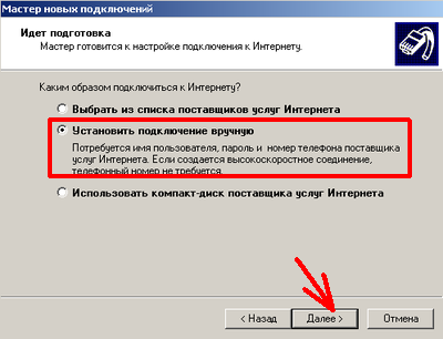 7.8 Выбираем "Установить подключение вручную", далее, выбираем "Через обычный модем", далее.