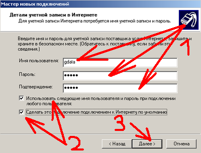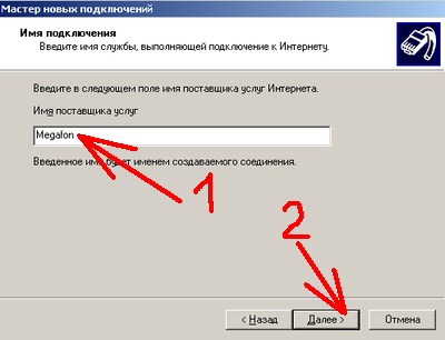 7.10 Присваиваем имя нашему подключению, например "Megafon" и жмем "Далее". Вводим номер телефона, в данном случае это *99#.