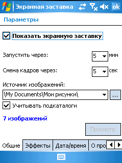 4. Заставка. Настройка, отключениеКогда КПК подключен к компьютеру, через 5 минут простоя на нем возникает заставка (как на большом компьютере). Чтобы это отключить или настроить необходимо при ее появлении удерживать в любом месте заставки стилус - это вызовет меню настроек заставки, в котором можно настроить ее появление, а также дополнительные возможности типа указания папки, откуда брать картинки и эффектов перехода, а также отключитьвключить данную заставку.