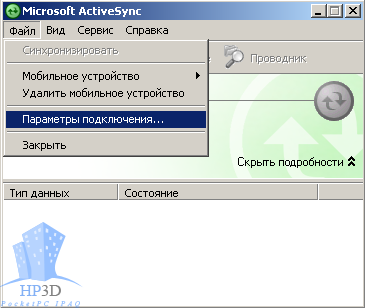 5.12 Теперь запускаем ActiveSync, Пуск >> Программы >> ActiveSync. Далее в нижнем правом углу нажимаем на кнопку Меню, и выбираем "Подключение - Bluetooth"