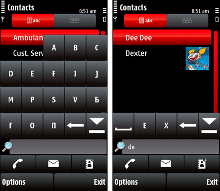 Облегчению поиска способствует и умная динамическая клавиатура, которая показывает только те буквы, которые соответствуют фактическому наличию контактов. После ввода первой буквы имени их число уменьшается, и остаются только те, которые действительно присутствуют в именах контактов. На самом деле, очень удобный инструмент. ![]()
