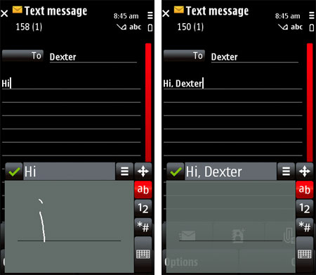 Наконец, особо пытливым предлагается в Nokia 5230 использовать функцию побуквенного распознавания рукописного текста. Однако писать каллиграфическим почерком не требуется, телефон готов учиться и довольно скоро «запоминает» руку хозяина и адекватно распознает все буквы. Так после трех дней общения с телефоном нам удалось написать от руки не просто короткое SMS, а целое письмо, пусть и небольшое. Однако нажимать кнопки виртуальной клавиатуры все же проще и быстрее. ![]()