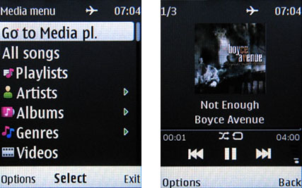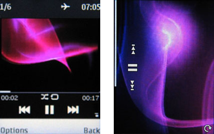 отдельный объект), обрезать, добавлять текст, спецэффекты, рамки. В Nokia 6303i Classic плеер воспроизводит как аудиофайлы, так и видеоролики. При проигрывании музыки на экране отображается из тега вся записанная информация. В фоновом режиме на экране остаются только обозначения управляющих элементов, само же управление производится навигационной клавишей. Интересно, что при воспроизведении видеоплеер также можно свернуть в фоновый режим. ![]()