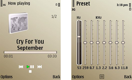 для упорядочивания содержимого вашей галереи. Мультимедиа Nokia E52 вполне способен проигрывать музыку, но плеер не столь привлекателен, как в мультимедийной линейке. Приятная новость - устройство оснащено стандартным аудиоразъемом, что не часто встречается в корпоративной линейке. Хотя отдельной кнопки для активации плеера нет, управлять им вполне удобно с помощью D-pad. Проигрыватель поддерживает форматы MP3, AAC, eAAC++ и WMA, а также плейлисты в формате M3U. В наличии - 5 пресетов эквалайзера, возможность создать свои настройки, а также подключение стереоэффектов. ![]()