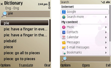 Утилита Search, или же «Поиск», поддерживает поиск по всему контенту мобильного телефона, от записи в телефонной книге до почтовых сообщений и содержимого карты памяти. Наконец, Nokia E52 оснащен словарем с богатой базой, дополнительные языковые базы к нему можно скачать с сайта Nokia. ![]()