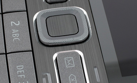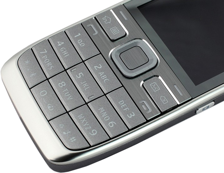 гигабайт. Жаль, но на кожаном чехле производитель сэкономил. Если вы уже сталкивались с телефонами Е-серии, то вы явно оцените узнаваемый и строгий стиль новичка Nokia Е52. Размеры новинки - 116x49x9,9 миллиметров, благодаря чему телефон очень удобно держать в руках и носить в кармане. В общем, на данный момент это один из самых тонких бизнес-смартфонов, а металлические детали корпуса добавляют элегантности, а также делают корпус устройства долговечнее. Из металла выполнена и навигационная клавиша ниже дисплея. Полированный металл задней крышки покрыт небольшими точками, благодаря которым телефон не скользит в руке. Навигационный блок и алфавитно-цифровые кнопки цвета графита красиво оттенены серебристой полоской, окантовывающей переднюю панель. ![]() Nokia E52