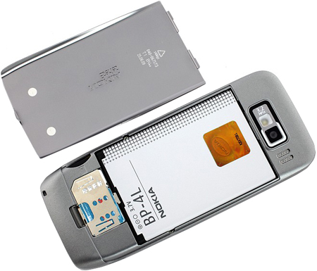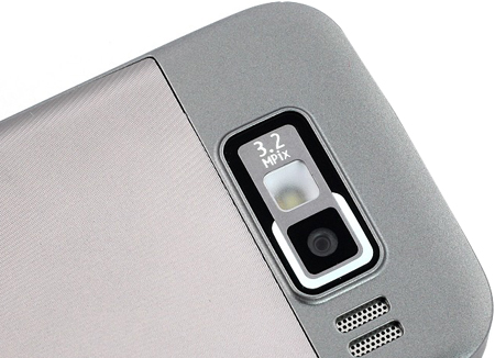 Задняя крышка Nokia E52 радует не только отблеском металла, но и тем, что практически не собирает отпечатков пальцев. На ней мы видим глазок 3-мегапиксельной камеры и LED-вспышку. Эти характеристики совершенно не впечатляют, но подробнее на камере мы остановимся позже. ![]()