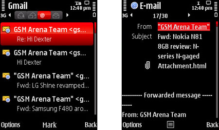 E-mail клиент чрезвычайно похож на те, что предлагались в других Symbian-телефонах. Если ваш аккаунт находится на одном из 1000 поддерживаемых популярных почтовых серверов, все необходимые настройки телефон возьмет оттуда, а вам останется лишь ввести адрес электронного ящика и пароль. ![]()