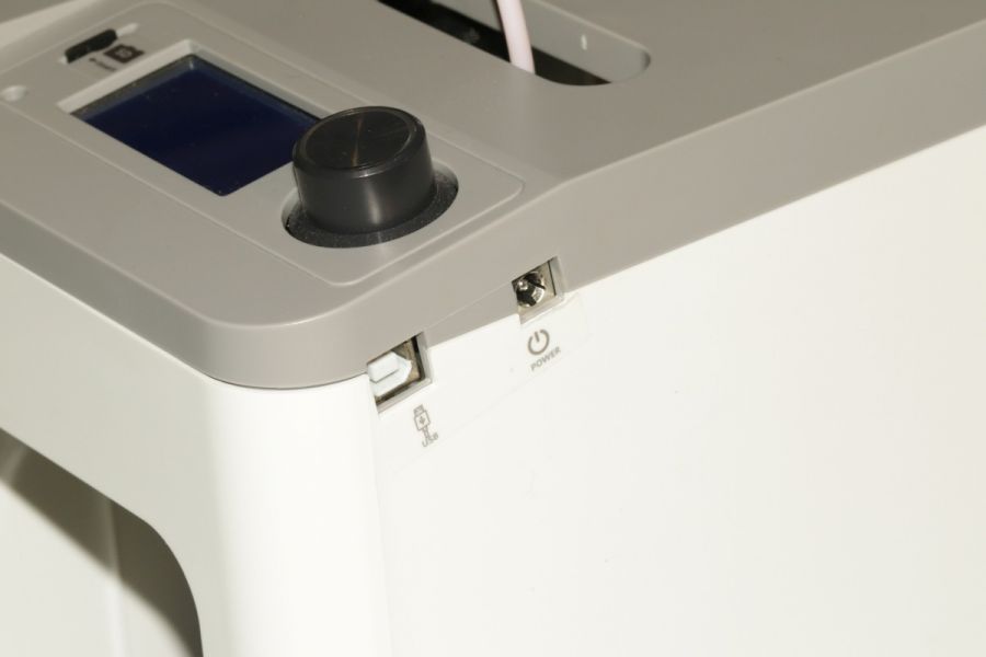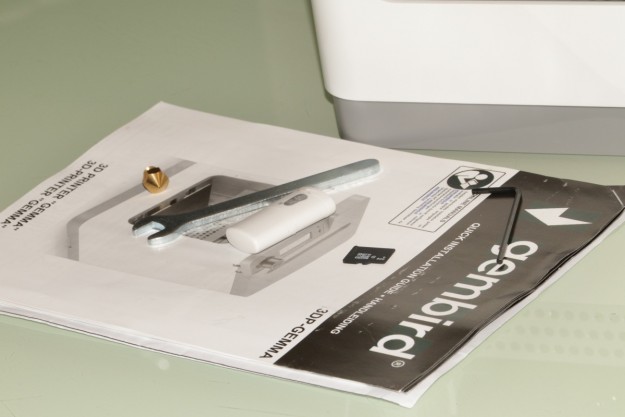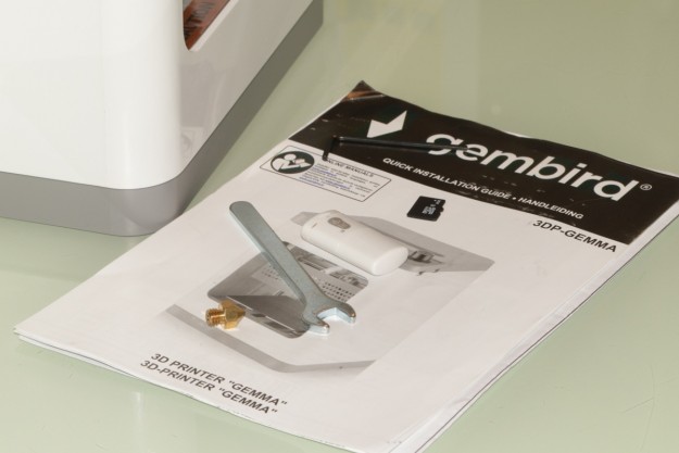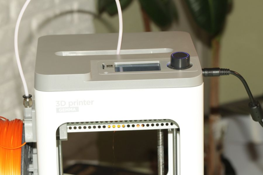 Коробка и комплект поставки Пользователь получит устройство в сравнительно компактной (особенно с учетом того, о каком изделии речь) картонной коробке, реализованной из переработанного сырья. Как и годится, у решений такого плана совершенно простой дизайн с уклоном в сторону информационности, то есть, мало картинок, но много различных данных, на которые от себя лично рекомендуем взглянуть, поскольку все ключевые особенности модели вынесены именно сюда. Внутри же коробки, помимо самого принтера пользователь «обнаружит» пошаговое руководство с иллюстрациями, карту microSD (8 ГБ), картридер под карты упомянутого формата, вкладыш с QR-кодом, переводящий на страницу регистрации продукта, шестигранный ключ, небольшую бухту филомента, блок питания с переключателем, гаечный ключ на 8, а еще запасную насадку. Впечатления от сборки Gembird 3DP-GEMMA – модель компактная и легкая. Это первое, что примечательно во внешности. Второе – выбранные материалы. Здесь много металла, хотя вес в конечном итоге невелик. Устройство можно транспортировать даже в рюкзаке, как это делал автор этих строк в отведенный тестовый период. Такой формат нисколько не обременительный. Выше мы уже говорили о большом количестве металла в корпусе принтера. Из этого типа материала фактически вся рабочая часть, тогда как сам каркас и некоторые отдельные детали реализованы из пластика. У последнего, кстати говоря, беспроигрышное сочетание цветов. Но к дизайну мы еще вернемся. Дисплей на панели сверху производитель прикрыл пластиковой подложкой. Вал справа также пластиковый. По сборке замечаний нет – все поставленные в этом плане задачи, на наш взгляд, выполнены должным образом, и даже слегка прогибающиеся стенки под сжатием не являются в этом плане сколько-нибудь слабым звеном, ведь эта их, скажем так, особенность ровным счетом ни на что не влияет. Дизайн и эргономика Вам наверняка понравится внешность Gembird 3DP-GEMMA – модель не просто компактная. Кроме того, она еще весьма аккуратная и стильная. Это тот формат, который впишется совершенно в любой интерьер, будь-то рабочий кабинет или домашняя комната. Скажем больше – некоторое время мы тестировали модель на кухне, и придя в гости коллега из другого офиса (не знаем в шутку или нет), спросил: “А что это, новый кухонный комбаин?” Словом, что ни говорите, но с дизайном здесь уж точно не проиграли. Касательно функциональных элементов, здесь ситуация следующая. На панели сверху расположен небольшой дисплей, который прикрывает пластиковая заслонка. Чуть правее от него – навигационный вал с функцией подтверждения выбора. Слева – слот для карт microSD. Система принтера поддерживает карты памяти до 8ГБ с файловой системой FAT32. На правую боковую панель вынесли два интерфейса – подключения адаптера питания и кабеля USB. Кроме того, на этой же “площадке”, но в самом ее низу в виде небольших пиктограмм реализован перечень ключевых особенностей и возможностей принтера. Противоположная “боковушка” примечательна откидным крюком для размещения здесь филамента, а также механизмом завода этого расходного материала. К вопросу о расходниках Для работы Gembird 3DP-GEMMA вам понадобится такой расходный материал как филомент PLA, PLA+ 1,75 мм. Стоимость его в Украине колеблется от 220-240 гривен за катушку 0,5 кг, что, на наш взгляд, совершенно недорого. Заправка расходник