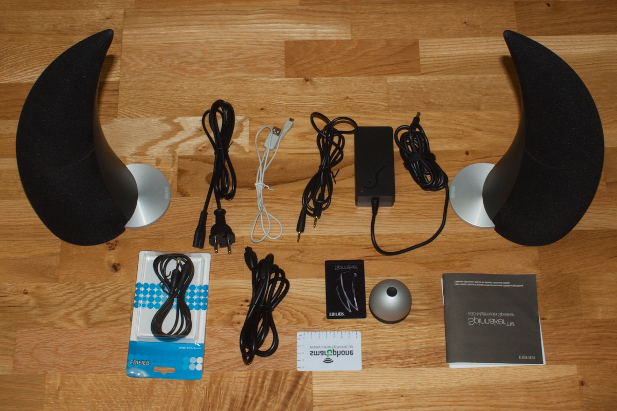Согласно спецификации, в комплект поставки входят две колонки, соединительный провод колонок, кабель питания, USB-заряжаемое дистанционное управление и комплект аудиокабелей для подключения данной акустической системы к разным источникам звука. Среди которых волоконно-оптический, соединительный (3.5мм) и USB-micro-USB кабель. В комплект также входит руководство пользователя на шести языках и отдельная инструкция на пластиковой карточке по использованию дистанционного управления. 8