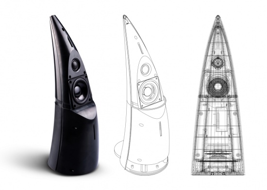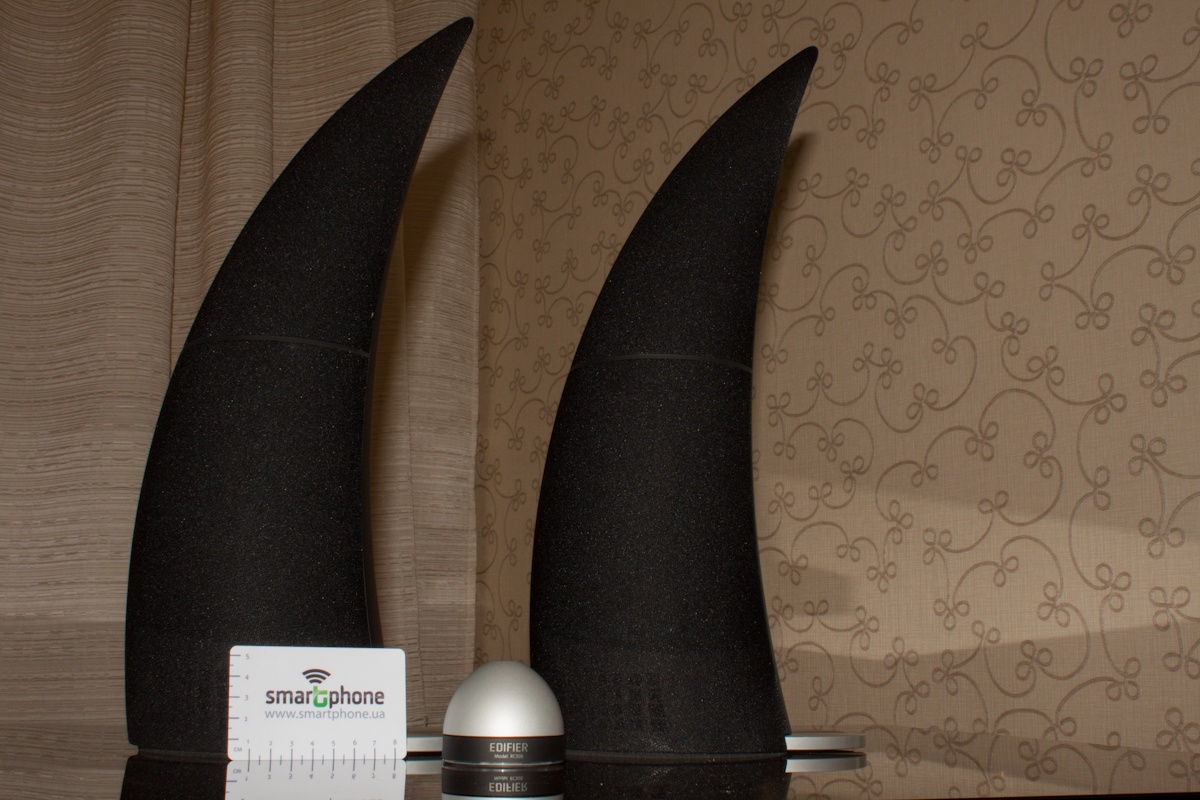 Учитывая все параметры акустической системы, ее внешний вид является одним из основных элементов, которому было уделено производителем едва ли не больше всего внимания. Благодаря необычным формам она выделяется среди любых других аудиосистем, представленных на рынке. Если смотреть сбоку, форма колонок напоминает паруса, именно так называет свои колонки производитель. Но на сравнении с парусами дело не останавливается, их вид дает возможность вдоволь пофантазировать –акульи плавники, пули, бивни мамонтов, клыки вампиров и тд.тп.