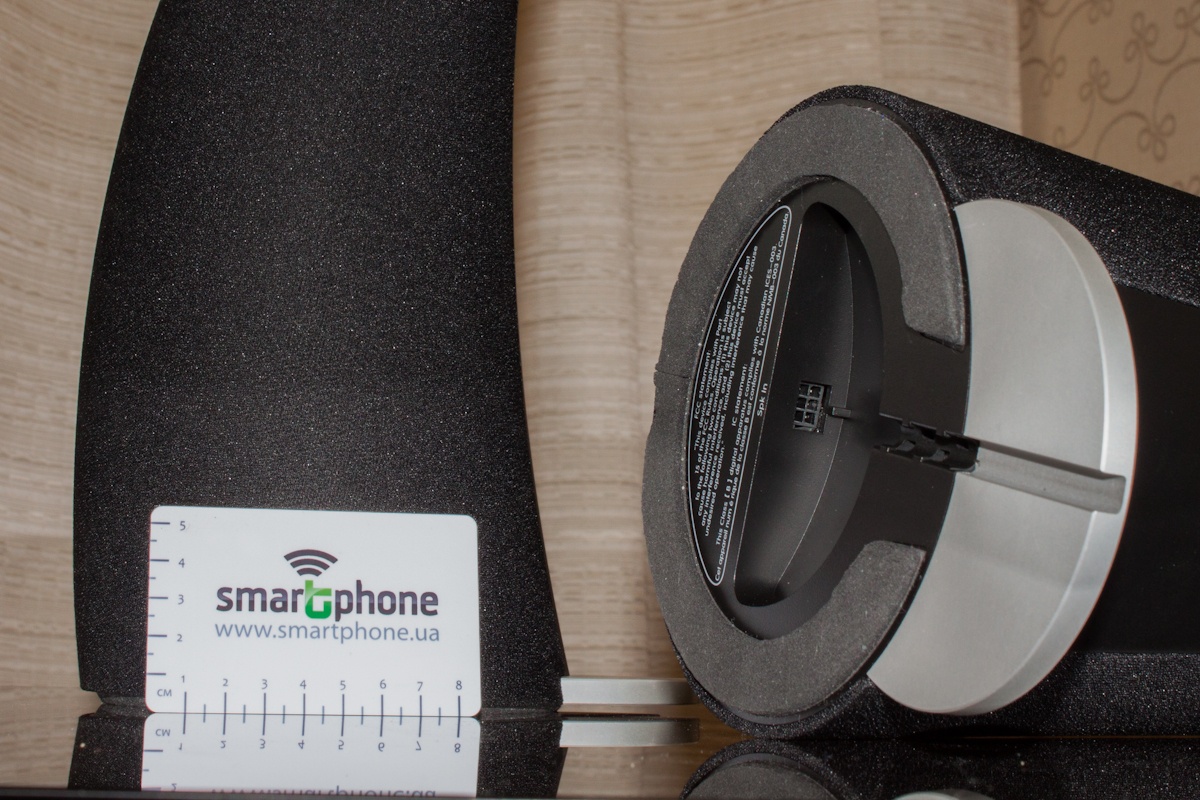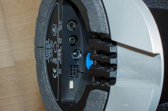 На нижней части активной колонки находятся разъемы под кабель питания, соединительный провод колонок, а также под волоконно-оптический, соединительный (3.5мм) и USB - micro-USB кабеля. Все шнуры прячутся в специальные углубления, что обеспечивает устойчивость колонок, препятствуют их колебанию во время звучания. С этой же целью под низом каждой из них находятся мягкие фиксаторы.