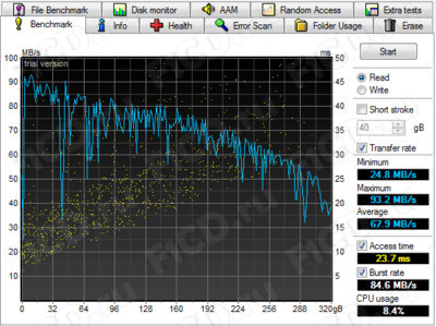 Графические бенчмарки, используемые нами в тестировании ASUS Eee PC X101H, выдали результаты, далекие от "играбельности" и совершенно непоказательные. В тестовой таблице показана оценка только 3DMark 06 — как можно увидеть, довольно плачевная. Тем не менее, поиграться в классические хиты — от Starcraft до Quake 3 — можно. Встроенный HDD-накопитель ASUS Eee PC X101H выдает очень хороший результат. Даже не во всех "полноценных" ноутбуках накопители работают на такой скорости. ![]() ![]() ![]() Время автономной работы ASUS Eee PC X101H — архиважный и для многих пользователей определяющий параметр нетбука. ASUS Eee PC X101H под нагрузкой продержался 3 часа 37 минут. Учитывая размеры нетбука и совершенно не впечатляющую по характеристикам батарею, результат очень приличный. ![]() Зарядка заняла 166 минут. ![]() Большую часть времени нетбук, скорее всего, проведет на коленях владельца, поэтому температура разогрева корпуса очень важна. Мы проверили температуру днища ASUS Eee PC X101H под нагрузкой в девяти зонах. Только в одной части нетбука разогрелся выше 30 градусов — неплохой результат для тонкого маленького корпуса.