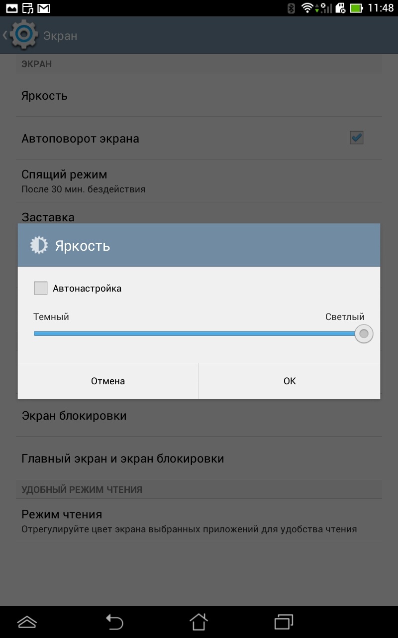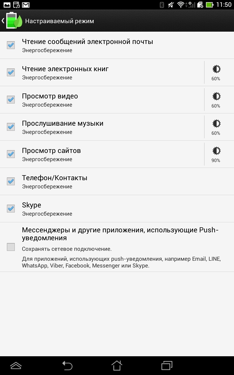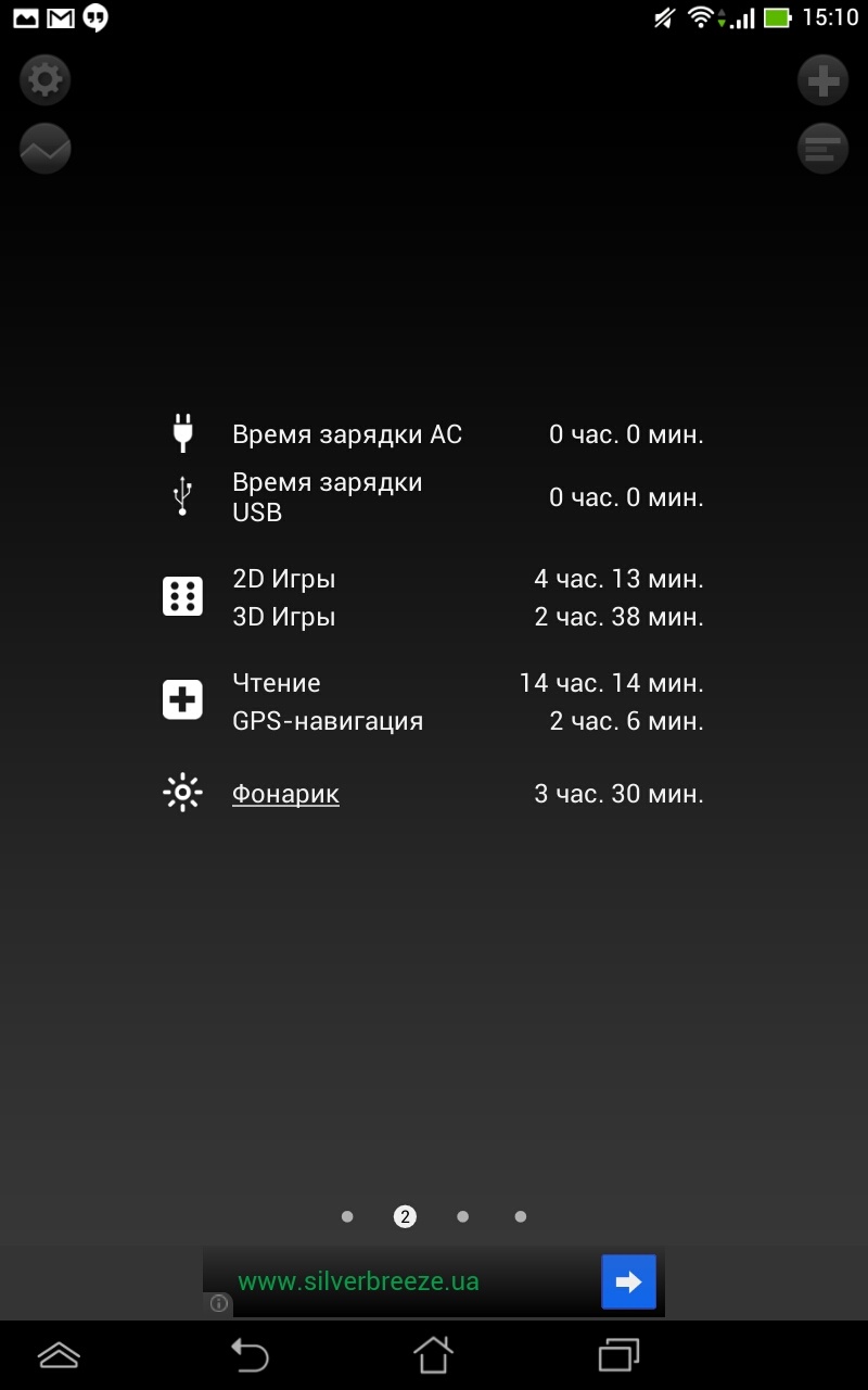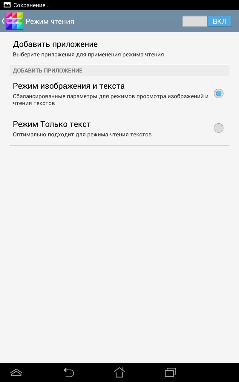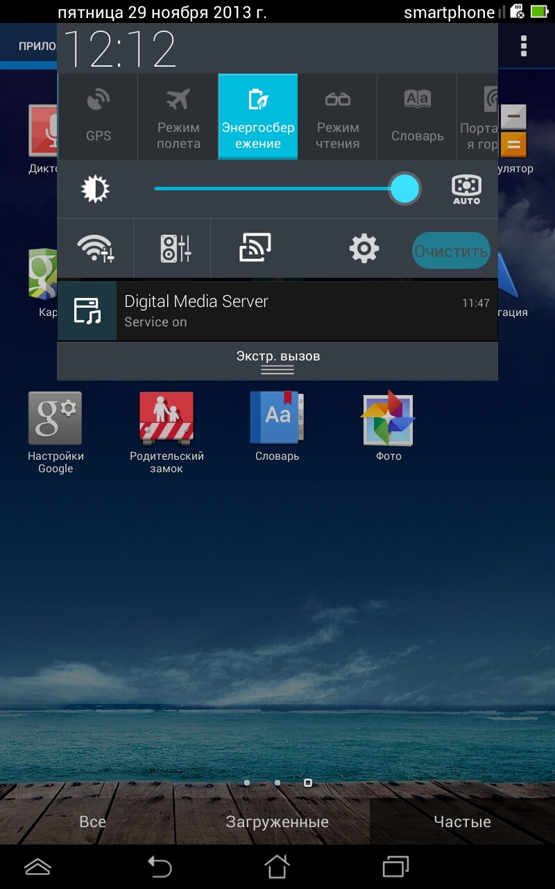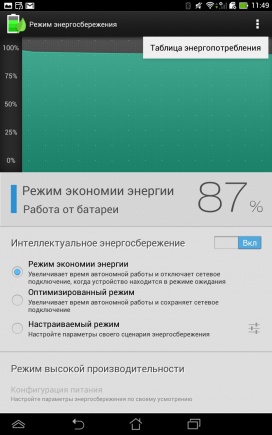 Энергопотребление, конечно же, во многом зависит от выбранного уровня подсветки экрана, значительно увеличивают его включенные беспроводные модули. В тоже время доступен режим энергосбережения, использование которого поможет уменьшить расход заряда батареи. Позволяет сохранить энергию планшета также предусмотренный здесь режим чтения. Активировать их можно как с меню Настроек, так и нажав необходимую иконку в меню Уведомлений.