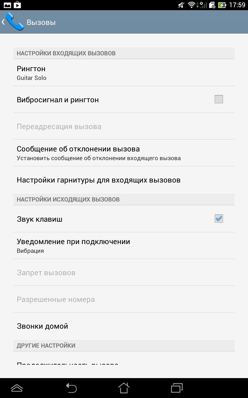 В разделе «Вызовы» в меню «Настройки» пользователю доступно большое количество всевозможных настроек входящих-исходящих звонков, интернет-телефонии и мн.др.