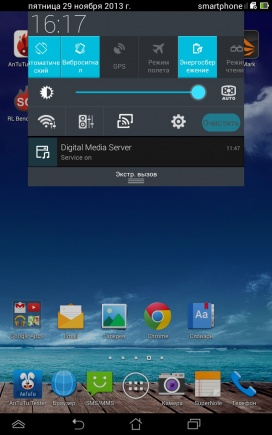 Интерфейс меню и экрана блокировки немного видоизменяется в зависимости от ориентации устройства. Интересна панель уведомлений, в ней помимо одноименных элементов выводятся иконки беспроводных модулей, значки перехода к различным настройкам. Отсюда доступна возможность активации режима чтения и множество других функций.
