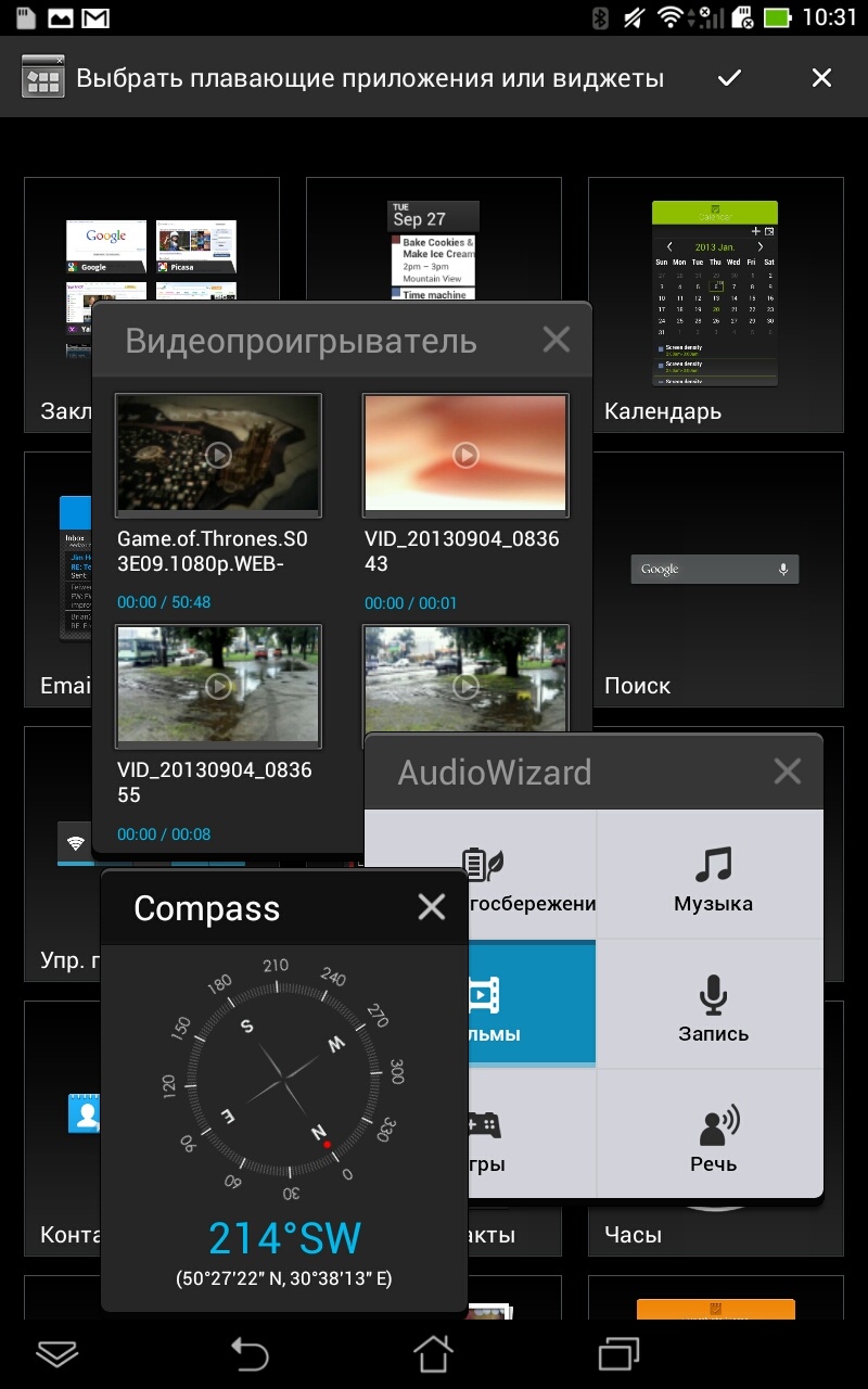 Еще одна примечательная особенность ASUS Fonepad 7 – «плавающие» приложения, что-то на подобии режима многозадачности. Доступ к ним открывается при нажатии специальной сенсорной кнопки внизу дисплея, расположившейся перед программными клавишами «Назад», «Домой» и «Недавние приложения». Список виджетов пользователь может менять по собственному усмотрению.