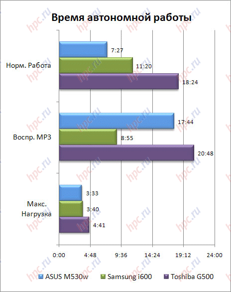 Время автономной работыКак уже упоминалось, емкость батареи из комплекта поставки составляет 1200 мАч. А заявленное время работы в режиме разговора – 4-5 часов, в зависимости от сети. Тестирование проводилось по хорошо знакомой вам схеме. Воспроизведение МР3. Экран отключен, громкость динамика установлена на максимум, через Windows Media Player в цикле воспроизводится MP3-файл с битрейтом 128 kbps. Время автономной работы в этом режиме составило 17 часов 44 минуты. Чтение текста. Все беспроводные модули отключены. На коммуникаторе запущено чтение текста с автоматической прокруткой. Обычно это делается при минимальной яркости экрана, однако здесь регулировки нет. Поэтому время работы составило всего 7 часов 27 минут. Максимальная нагрузка. Включены оба беспроводных модуля (Bluetooth и Wi-Fi), через Windows Media Player в цикле воспроизводится видеоролик. Время работы – 3 часа 33 минуты. При обычном использовании, если не слишком активно разговаривать и не использовать подолгу беспроводные интерфейсы, смартфон работет около полутора суток. При более активном использовании, с просмотром видео и прослушиванием МР3, аккумулятор разряжается как раз за сутки. А что касается времени разговора, то оно примерно соответствует тем значениям, которые указаны на сайте производителя. Нормальные показатели. Ни больше, ни меньше. А на приведенной диаграмме вы можете видеть, как выглядят результаты ASUS M530w в сравнении с другими смартфонами.