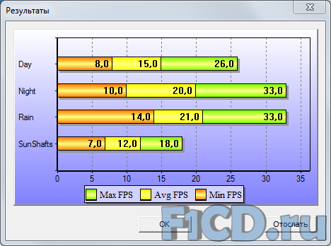 Неплохие результаты – ведь из нашего обзора HP ProBook 6555b мы знаем, что там находится не менее двухъядерный представитель мобильного семейства от AMD, и в нашем сегодняшнем подопытном Intel Core i3 очень неплохо себя показывает, хотя до старшего собрата – Intel Core i7 в Acer Aspire 8951G – ему очень далеко. Теперь – к игровым тестам на мощность дискретного видеоядра, и результаты мы получили следующие: