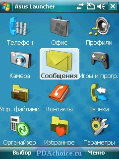 Интересно, что Asus 526 обзавелся специальной оболочкой Asus Launcher, как на обычных мобильных телефонах, где можно представить пункты меню, как в виде иконок, так и в виде списка, по которому, кстати, значительно удобнее перемещаться, так как колесо прокрутки работает только в двух направлениях, а не в четырех как джойстик.