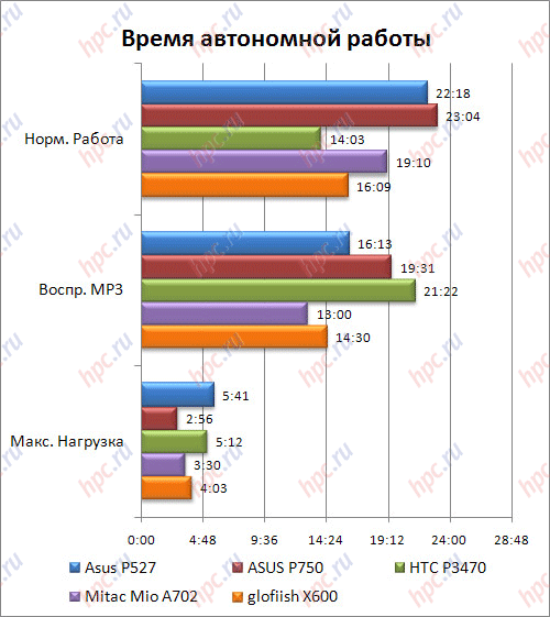Видеовозможности откровенно слабоваты. Здешняя камера не способна даже писать ролики в QVGA-разрешении. Максимальное разрешение составляет 176 x 144 в формате 3GP и 160 x 120 в mp4. Кроме того доступны еще 128 x 96 и 80 х 60. Настройки видеосъемки в точности повторяют параметры при работе с фото. Однако на фоне всей этой заурядности обнаружилась одна примечательная деталь – осуществлять зумирование можно прямо во время съемки, а не заранее как в прочих коммуникаторах. Ниже приведены примеры работы камеры в режиме видео с максимальными настройками качества. Выводы предлагаем сделать самостоятельно. Время автономной работыЗамер времени автономной работы происходил по стандартной методике, не претерпевшей никаких изменений с момента публикации последнего обзора. А перед тем, как взглянуть на результаты, напомним, что емкость аккумулятора из комплекта составляет 1300 мАч, а заявленное производителем время работы – до 200 часов в режиме ожидания и до 5 часов в режиме разговора. Режим максимальной нагрузки. Яркость подсветки выставлена на максимум, громкость динамика тоже, включены Bluetooth и Wi-Fi модули, а через Windows Media Player в цикле в цикле воспроизводится "тяжелый" видеоролик. Время автономной работы в этом режиме составило 5 часов 41 минуту. Нормальная работа. Все беспроводные модули отключены. Яркость подсветки установлена на минимальный вровень. На коммуникаторе запущено чтение текста в программе AlReader с автоматической прокруткой. Время работы составило 22 часа 18 минут. Воспроизведение МР3. Беспроводные модули и подсветка экрана выключены. Прослушивание музыки через наушники на максимальной громкости. Использовался Pocket Media Player и файлы с битрейтом 192 kbps. Время работы – 16 часов 13 минут. Что ж, неплохо. Не рекорд, конечно, но явно выше среднего. Отдельно хотелось бы отметить режим максимальной нагрузки, в котором коммуникатор держится более пяти с половиной часов. ASUS P750 в этом отношении выглядел хуже. Сказывается энергопотребление процессора при работе на максимальной частоте. А вот в других режимах флагман проявил себя чуть лучше, чем P527. При использовании навигации с отключенными модулями связи (включая телефонный) и минимальной подсветкой, коммуникатор работал шесть часов, что тоже довольно неплохо. А приведенная диаграмма наглядно показывает, как смотрится ASUS P527 в сравнении с коммуникаторами-конкурентами.
