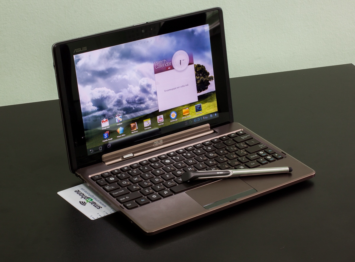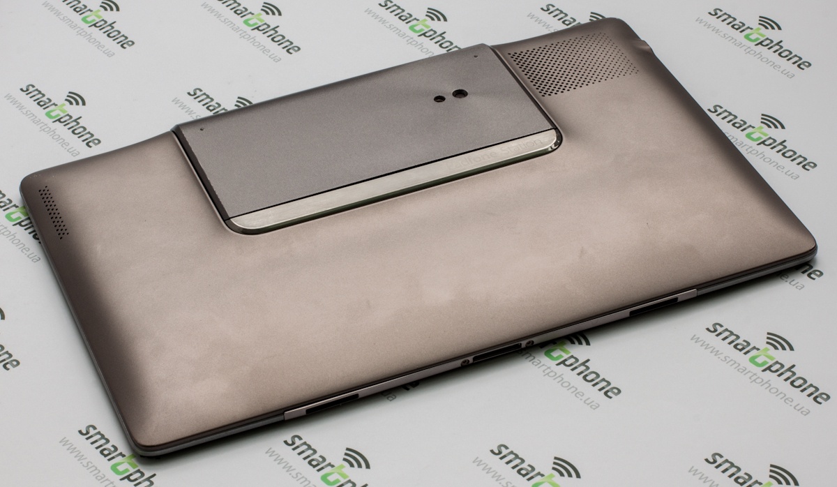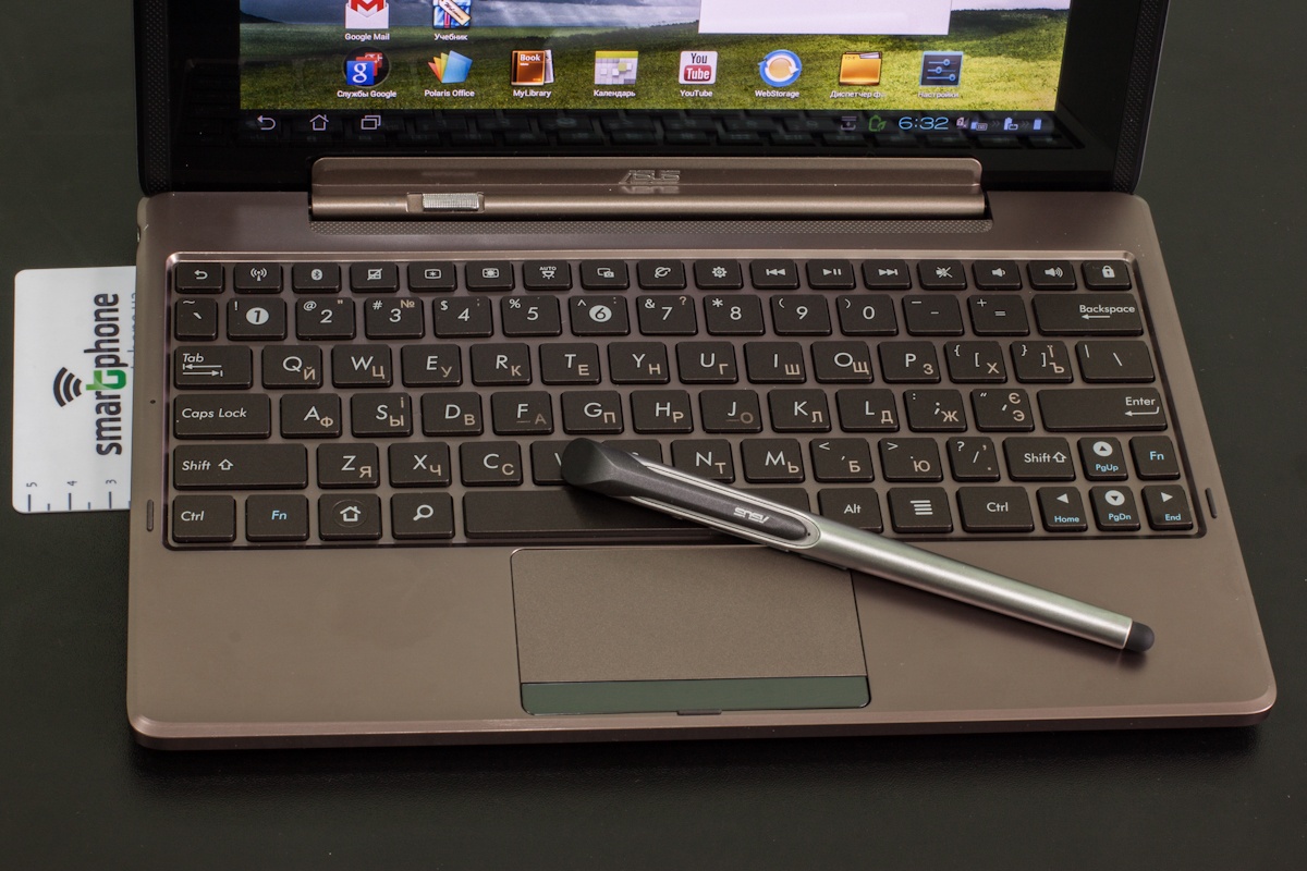 Конечно же, ключевые позиции на лицевой панели у дисплея. Он занимает здесь почти все место. Если установить планшет на клавиатуру и рассматривать, таким образом, справа и слева легко заметить небольшие пластиковые вставки, которые стекло не прикрывает. Визуально такое оформление можно принять за реализацию выводов встроенных динамиков, но в сущности это только декор. Динамики же вынесены на тыльную панель Padfon Station.