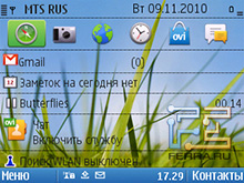 Кроме того, в Nokia E5-00 есть встроенный радиоприёмник. Ловит хорошо, но есть один нюанс: работать приёмник будет только при подключённой гарнитуре (её шнур выполняет роль антенны). Программное обеспечение, особенности использованияПО – больное место Nokia E5-00, равно как и всех разработок Nokia до недавнего времени (о Symbian^3 нужен отдельный разговор). При использовании аппарат вызывает смешанные чувства. С одной стороны, это старый добрый Symbian, со всеми своими плюсами; с другой стороны, это старый, даже устаревший, Symbian, со всеми его недостатками. Для неподготовленного человека полноценное использование смартфона со всеми его функциями может оказаться задачей непростой. Варианта использования два: просто звонить и писать СМС, либо же читать форумы, исправлять недоработки стандартного ПО, подстраивать телефон под себя. Пройдёмся по программной части подробнее. Рабочий стол практически не претерпел изменений по сравнению с тем, что можно видеть в других смартфонах Eseries. По-прежнему есть несколько вариантов представления рабочего стола, а для одного из них («Активный») теперь возможно настроить два режима: для рабочего времени и для «мирной» жизни. Переключение между режимами осуществляется за пару секунд, да и в меню этот пункт спрятан совсем неглубоко.