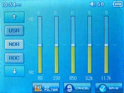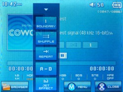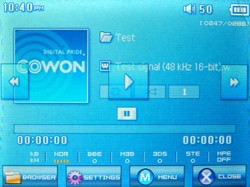 Рис. 2. Измеренная АЧХ wav 16bit 48kHz Подробные результаты wav 16bit 44.1kHz — www.onliner.by/cont/CowonD2_44_1wav.PDF АЧХ плеера ровная. Файлы 48 кГц при проигрывании имеют ожидаемо более высокое значение верхней граничной частоты воспроизведения. Подробные результаты измерений показывают, что проигрыватель имеет качественный аудиотракт. Огромным плюсом плеера является возможность воспроизведения lossless-форматов flac и ape, так что меломаны, хранящие свои записи в таком виде (а большая часть музыки, сжатой без потерь и доступной в сети, именно в этих форматах и представлена), теперь могут прослушивать их без предварительной конвертации. Хотя тут есть один недостаток: до сих пор Cowon не реализовала поддержку *.сue, так что альбомы, записанные одним файлом, приходится прослушивать не имея возможности удобной потрековой навигации. MP3, WMA, OGG и WAV воспроизводятся без проблем. Наушники из комплекта ничем примечательным в плане звука не выделяются (как, впрочем, практически у всех плееров) и служат скорее для проверки работоспособности. Чтобы оценить реальный потенциал проигрывателя (особенно учитывая его возможности по воспроизведению форматов сжатия без потерь), их стоит поменять на более качественный вариант. Прослушивание производилось с использованием следующих наушников: Etymotic ER-4p, Audio-Technica ATH-AD700, Philips SBC HP895, KOSS Porta Pro. Громкости у плеера — с запасом. Например, в Etymotic ER-4p достаточно порядка 18—25 делений шкалы для комфортного прослушивания музыки на улице. Даже относительно малочувствительные накладные Philips на максимальной громкости использовать не очень приятно — слишком громко. При этом явно слышимых искажений усилителя нет, звук четкий, насыщенный, без хрипов. Есть довольно много способов изменить звучание на свой вкус: пятиполосный эквалайзер, предустановленные варианты (Normal, Rock, Jazz, Classic, Pop, Vocal) и одна пользовательская. • BBE — улучшает звучание форматов с потерями (mp3, wma, ogg). Совокупность всех настроек обработки звука может быть сохранена в пресетах JetEffect. Имеется возможность отображения обложек во время проигрывания аудиофайлов. Этого можно добиться двумя путями: • скопировать в папку с треками файл с именем cover.Jpg (изображение обложки); Размер области экрана, отображающей желаемую обложку, имеет разрешение 92×92 пикселя, поэтому целесообразно использовать изображение именно такого размера. ВидеоВидео для просмотра необходимо подготавливать. Файл, скопированный с компьютера, проигрываться, скорее всего, не будет. Для конвертации Cowon предлагает использовать свою фирменную утилиту JetAudio, хотя ничто не мешает воспользоваться и другими программами. Главное — выставить нужные параметры кодирования. Плеер поддерживает воспроизведение видеофайлов со следующими параметрами: AVI Воспроизводятся файлы гладко. Размера экрана хватает, чтобы более-менее комфортно просматривать в пути небольшие по длительности видеоролики. Для продолжительного просмотра в компании экран все же маловат. Более подробно работа с видео описана вот на этом ресурсе, созданном любителями Cowon D2. ВыводыПлеер отличается хорошим сочетанием характеристик. Это обязательно понравится тем, кто планирует использовать Cowon D2 прежде всего для прослушивания музыки. Мелкие недочеты, выявленные нами в процессе тестирования, значительных неудобств при реальной эксплуатации не доставляют. С учетом довольн