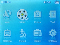 При такой настройке появляется возможность управлять плеером вслепую, выполняя большую часть самых необходимых при прослушивании музыки действий (изменение уровня громкости, остановка/возобновление проигрывания, смена трека) путем нажатия на эти кнопки, чего в основном лишены устройства с ориентированным на сенсорное управление интерфейсом. Незначительный недостаток клавиш заключается в том, что они выполнены в виде одной длинной полосы, и разобрать на ощупь где какая не всегда легко, особенно через одежду. Чувствительность дисплея к нажатиям находится на достаточном уровне даже при наличии защитной пленки, и проблем с этим не возникает. В целом уровень реализации и эргономики управления в плеере высок. Возможность пользоваться проигрывателем не видя его также добавляет удобства. Скорость отклика аппарата хорошая, подтормаживаний не наблюдается. МенюГлавное меню представляет собой набор пиктограмм, служащих кнопками для вызова соответствующих функций. Здесь расположены кнопки доступа к различным видам медиа, настройкам, функциям: • Music (Музыка) — прослушивание музыки.